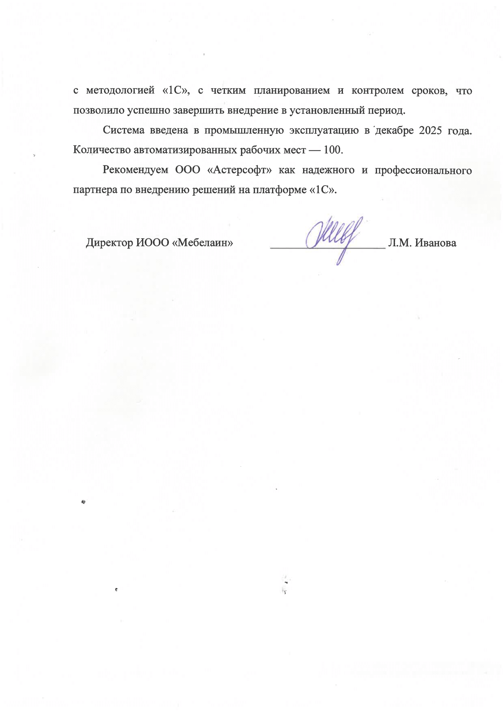 Рекомендуем ООО «Астерсофт» как надежного и профессионального партнера по внедрению решений на платформе «1С».