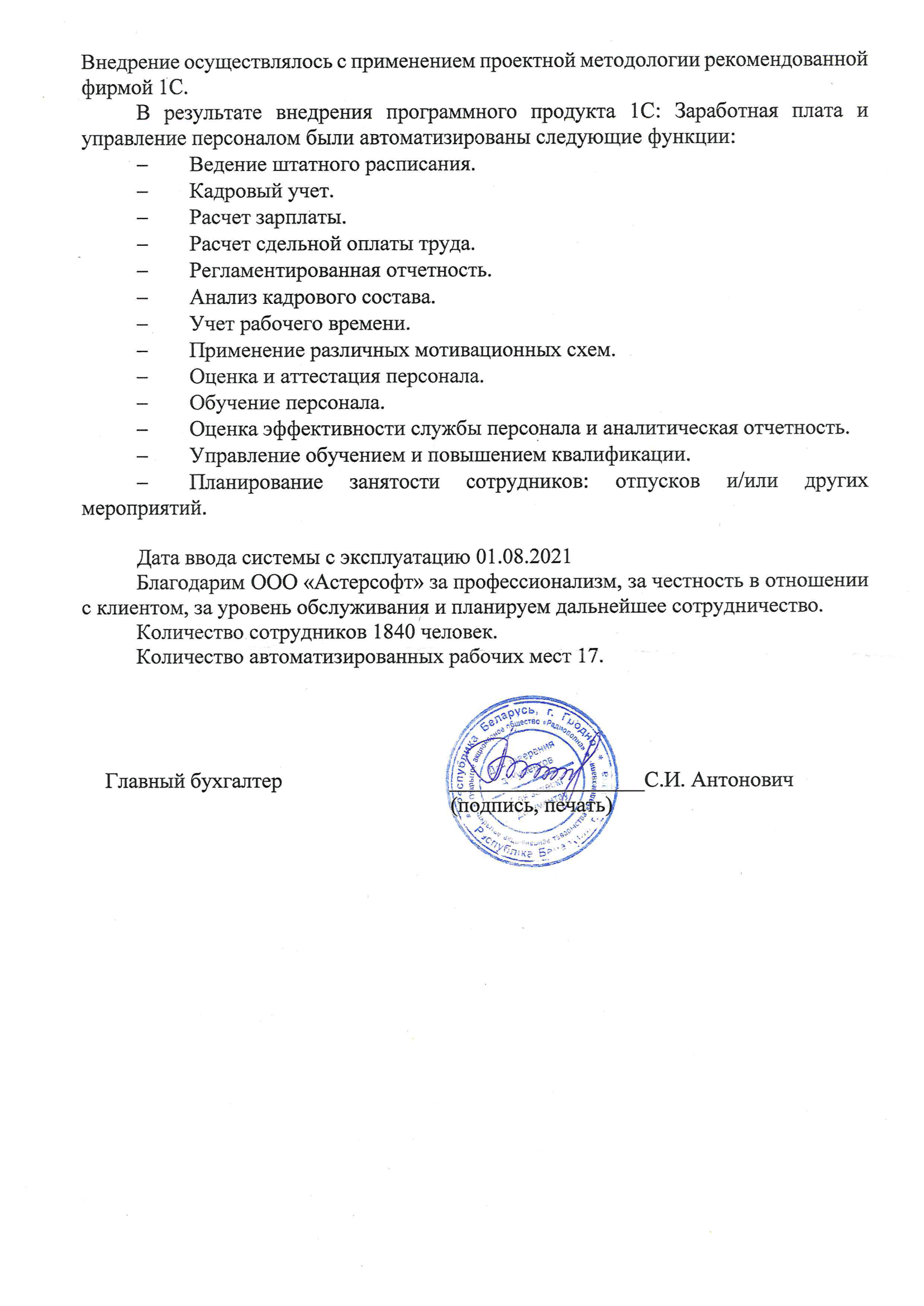Отзыв на внедрение 1С:Зарплата и управление персоналом 8 для Беларуси на ОАО «Радиоволна»