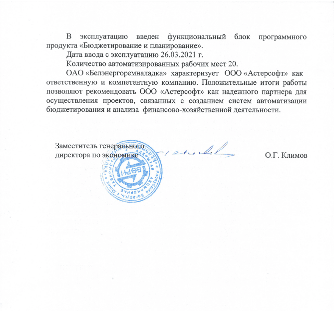 Отзыв на внедрение 1С:Предприятие 8. ERP Управление предприятием 2 для Беларуси на ОАО «Белэнергоремналадка»