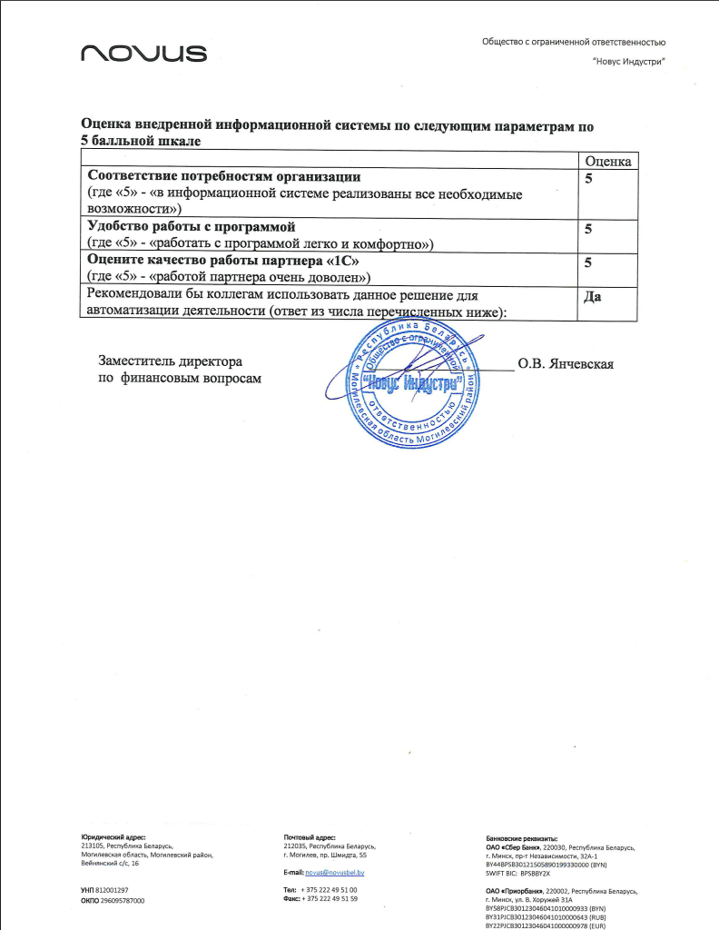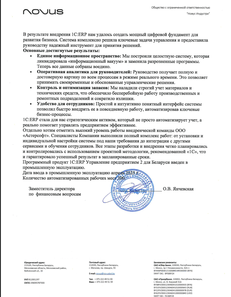 Отзыв на внедрение 1С:Предприятие 8. ERP Управление предприятием 2 для Беларуси на ООО «Новус Индустри»