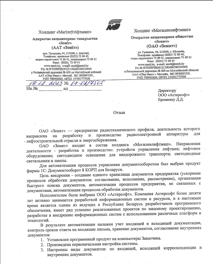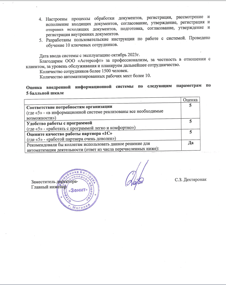Отзыв на внедрение 1С:Документооборот КОРП для Беларуси на ОАО «Зенит»