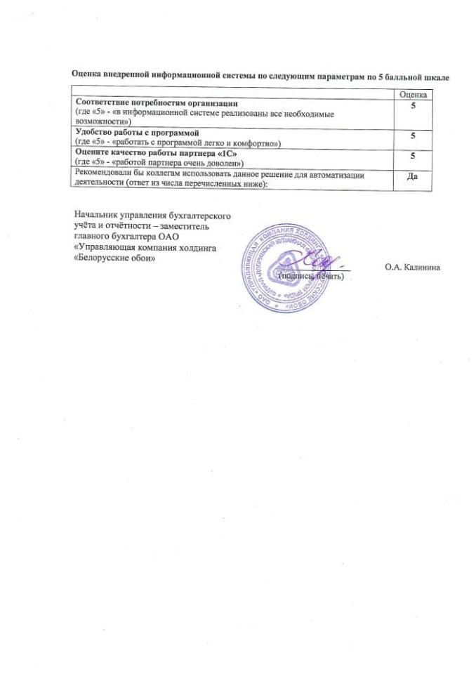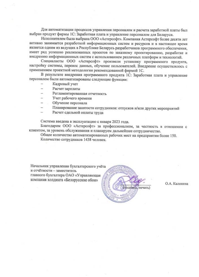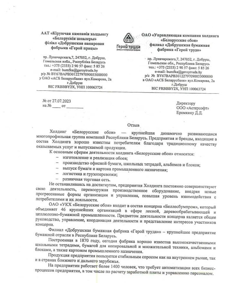 Отзыв на внедрение 1С:Зарплата и управление персоналом 8 для Беларуси на филиал «Добрушская бумажная фабрика «Герой труда»